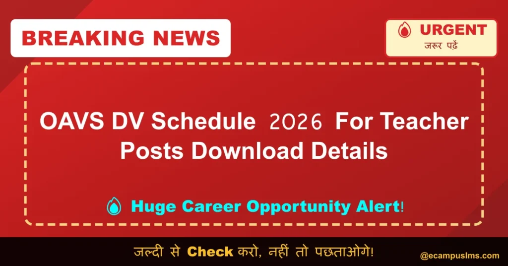 The Odisha Adarsha Vidyalaya Sangathan (OAVS) has released the Document Verification (DV) Schedule 2026 for the recruitment of Teacher posts. Candidates who have been shortlisted must appear for the document verification process on the scheduled dates. The DV schedule was released on 9 March 2026 and the verification will be conducted from 25 March 2026 to 27 March 2026. Candidates can check the DV notice and schedule through the official website oavs.in.